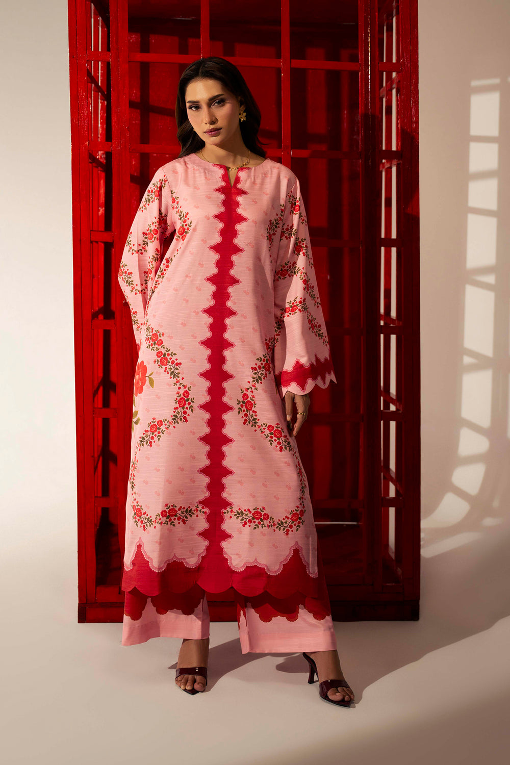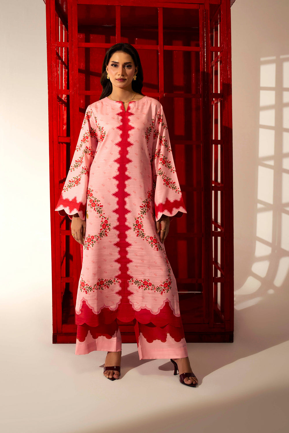 • Sleeves: Full-length wide bell sleeves with semi-circular scalloped finishing.